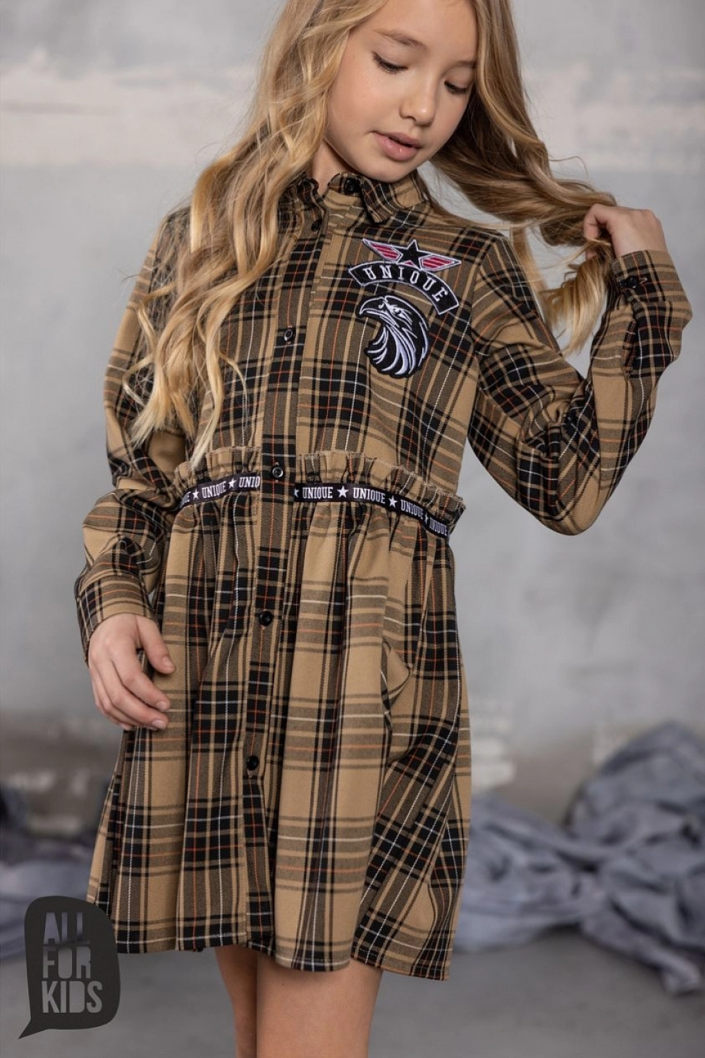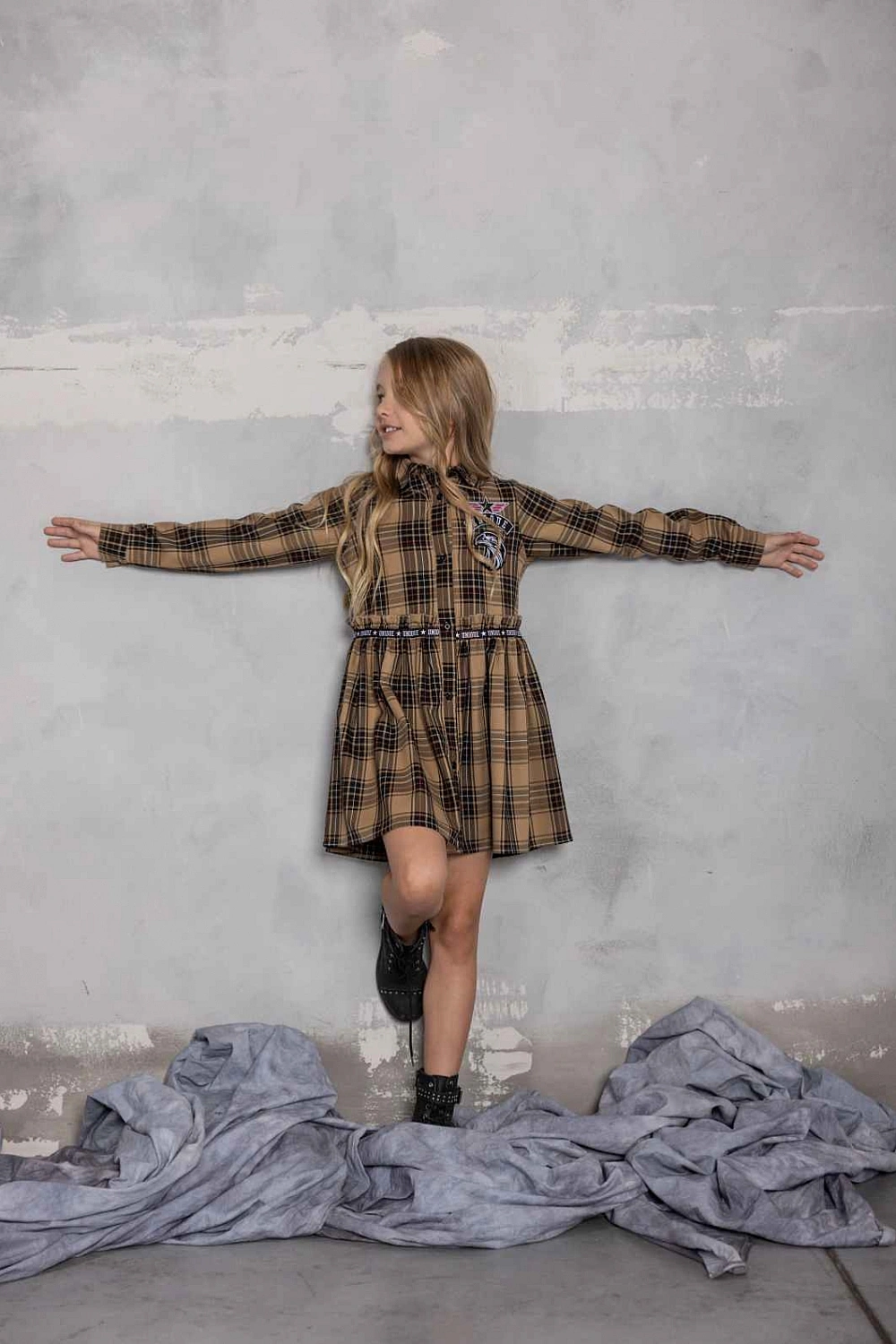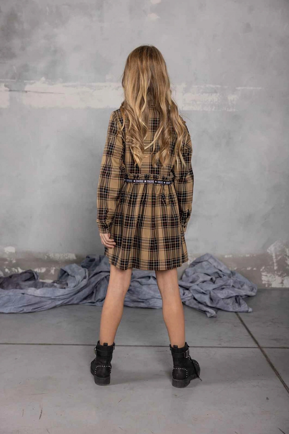 Štýlové, káro šatky s golierom, zapínaním na gombíky, nášivkou a stuhou s nápisom.