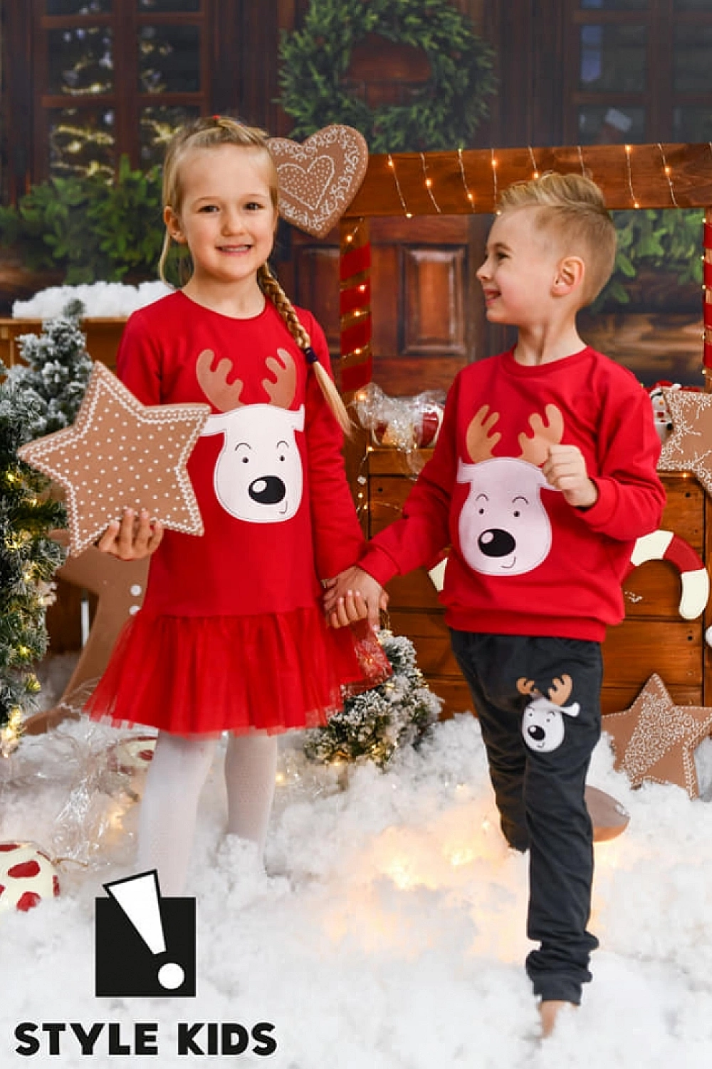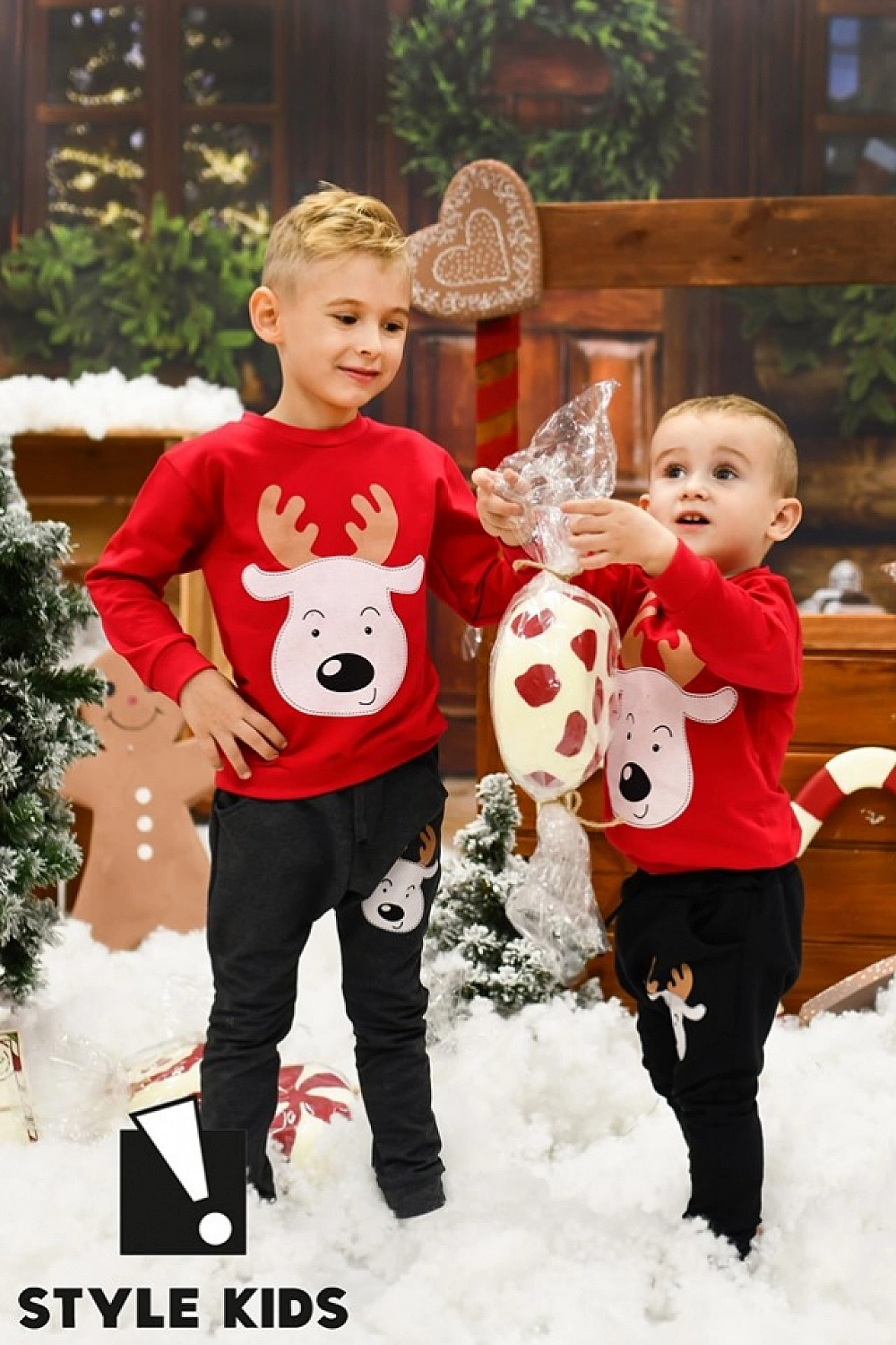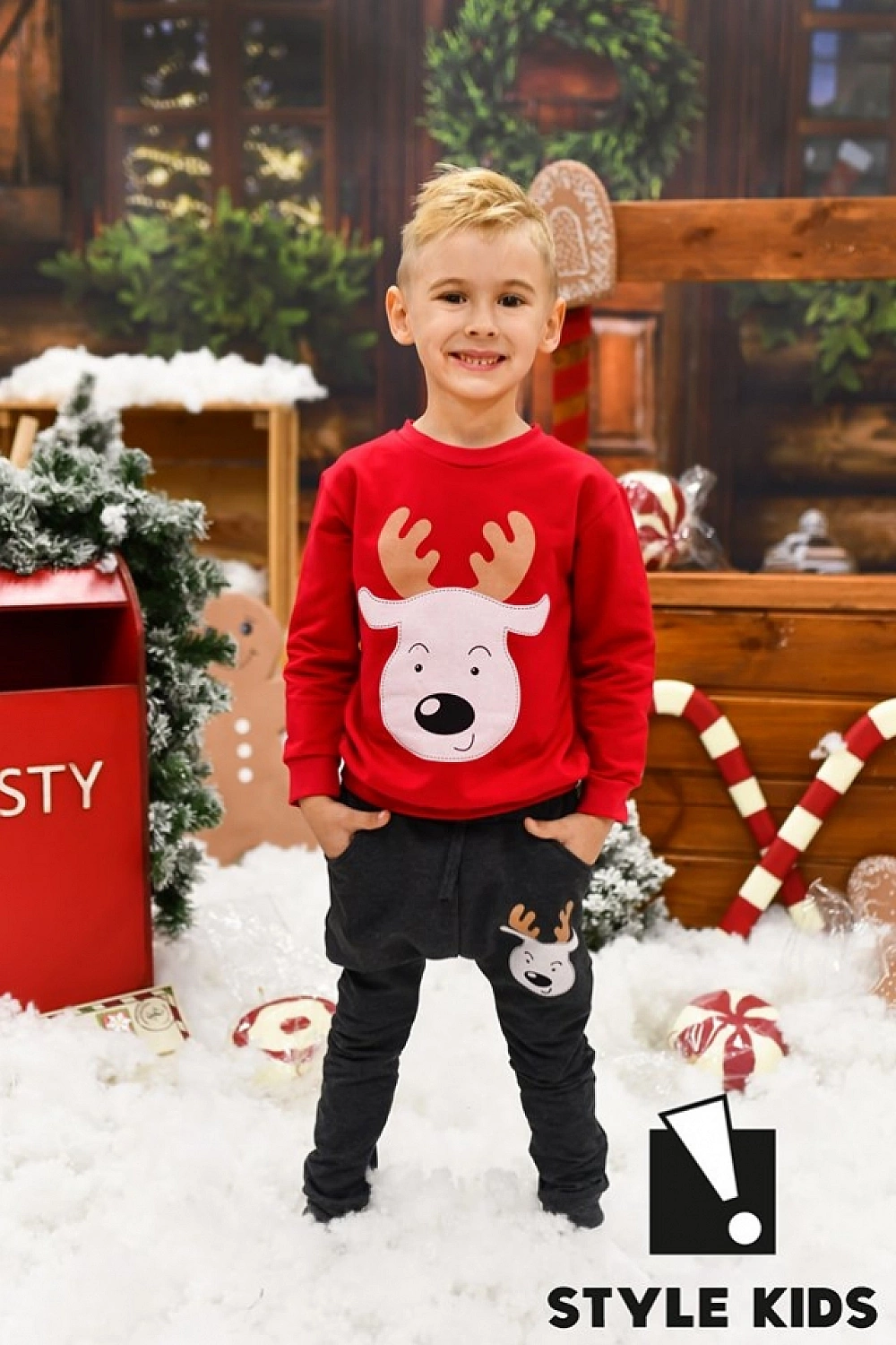 Vianočný komplet pre chlapcov - červená mikina s potlačou sobíka a sivé, zateplené tepláčiky s vreckami a rovnakou potlačou.